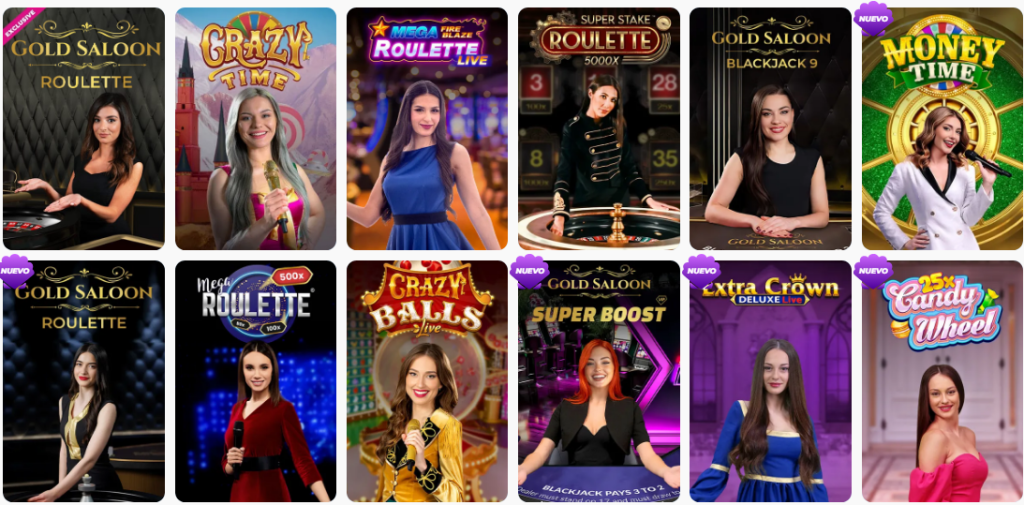 - Juegos de casino en vivo – Ruleta, Blackjack, Bacará, Sic Bo y shows interactivos como Crazy Time o Monopoly Live.